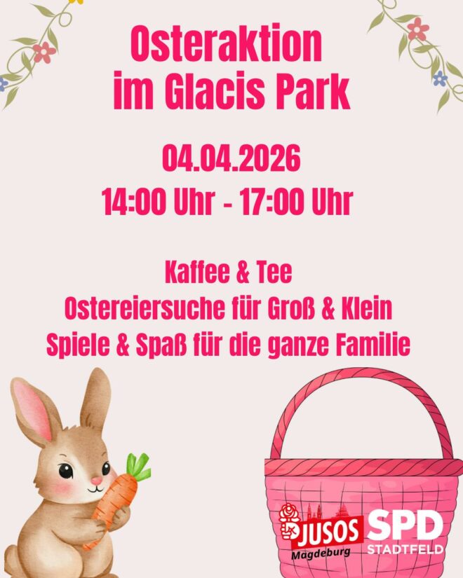 Am morgigen Samstag, 04.04.2026, lädt der SPD-Ortsverein gemeinsam mit den Jusos von 14:00–17:00 Uhr zu einer Osteraktion im Glacis- Park ein. Es gibt Ostereiersuche, Ostereiertrudeln und Eierlauf für Groß & Klein. Kaffee & Tee zum Aufwärmen bieten wir auch an. … Weiterlesen